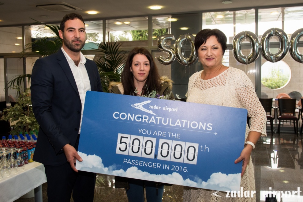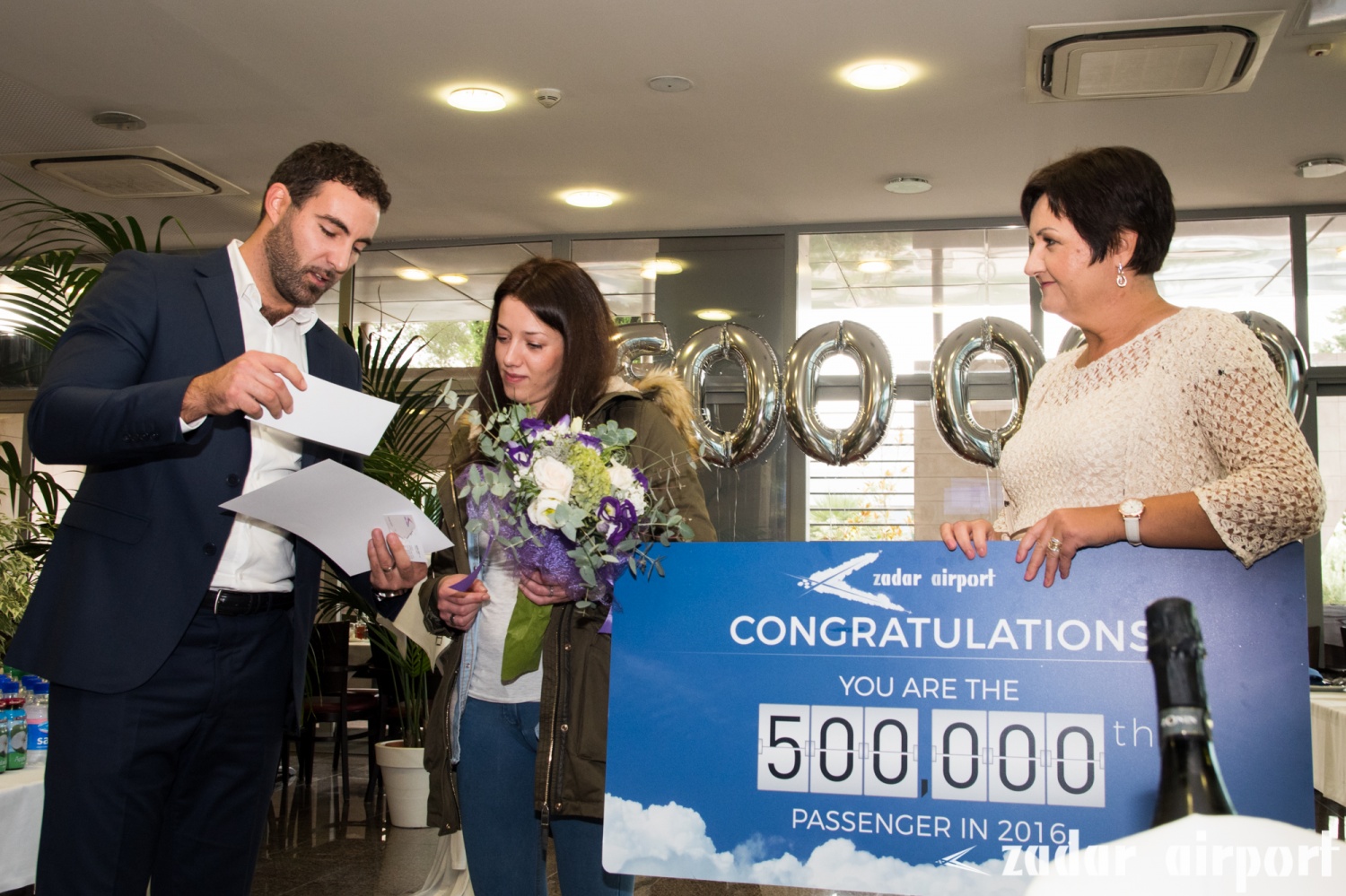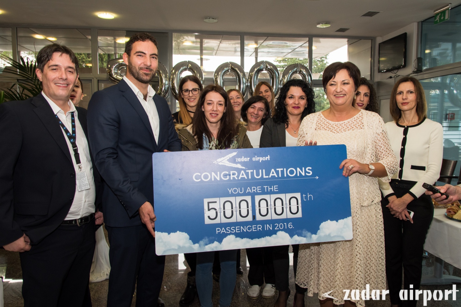 Povodom dolaska petsto tisućitog putnika u Zračnoj luci Zadar je priređena mala svečanost, a dobrodošlicu petsto tisućitom putniku poželjeli su zaposlenici Zračne luke Zadar na čelu s direktoricom Irenom Ćosić koja je uručila prigodan poklon – povratnu kartu i poklon bon u DFS trgovini Zračne luke Zadar.